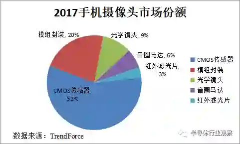 手机摄像头模组的核心零部件主要包括:图像传感器(CIS)、镜头(Lens)、音圈马达(VCM)、红外滤光片(IRCF)等。主要供应商都集中在亚洲的日本、韩国、中国大陆、中国台湾地区。根据TrendForce发布的手机产业链市场数据, 2017年CMOS传感器的市场份额最大,之后依次是模组、光学镜头、音圈马达和滤光片。 双摄应用后,模组封装技术难度增大,镜头要求更高,因此其相应产业链的附加值提升速度已加快。