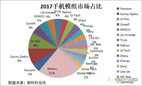 双摄模组厂供应商非常多,位于第一梯队的主要有:舜宇(Sunny)、欧菲光(O-Film)、三星电机(SEMCO)、LG Innotek(苹果手机供应商)、丘钛(Q-Tech)、信利(Truly)、光宝(Liteon)。下图是2017年手机摄像头模组厂市场占有率(数据来源:TSR)