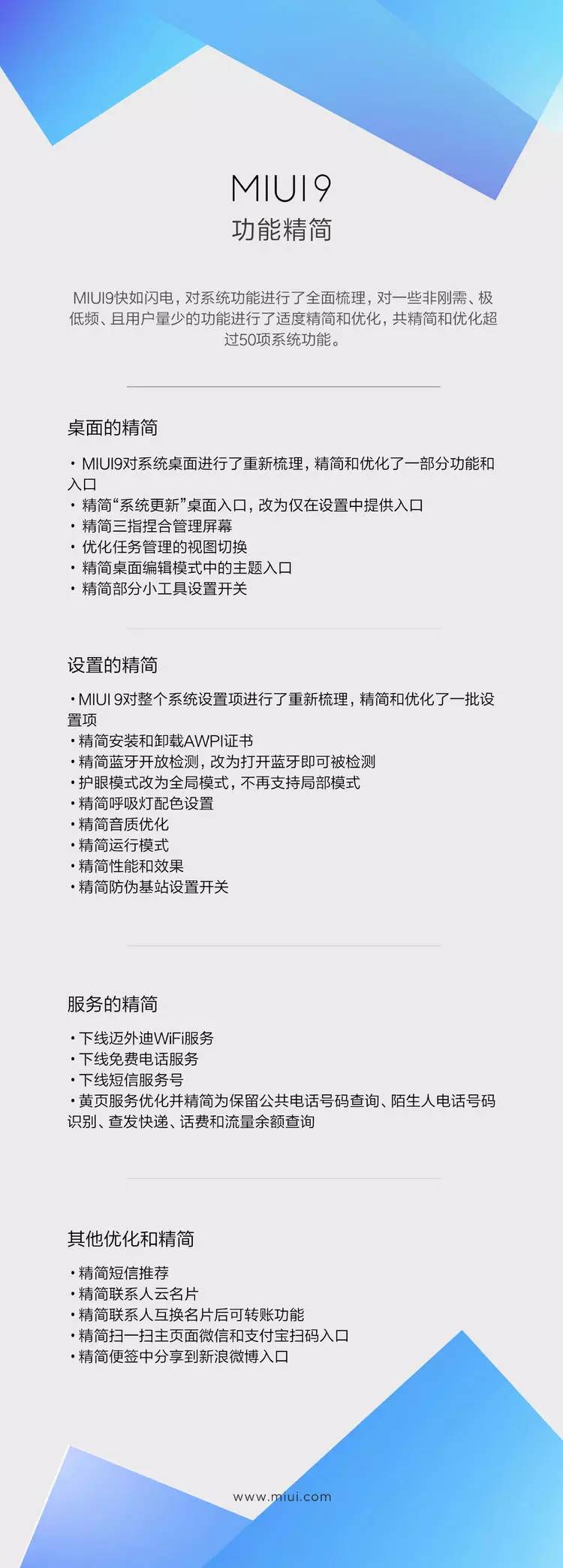 最新的 MIUI 9 以「快如闪电」为口号,在加入几个新功能提升效率的同时,也舍弃了很多东西。MIUI 9 中第一次开始对系统进行大规模精简,共精简和优化了超过 50 项系统功能。对于在定制 ROM 中领跑数年的 MIUI 来说,做减法要比加法难得多。