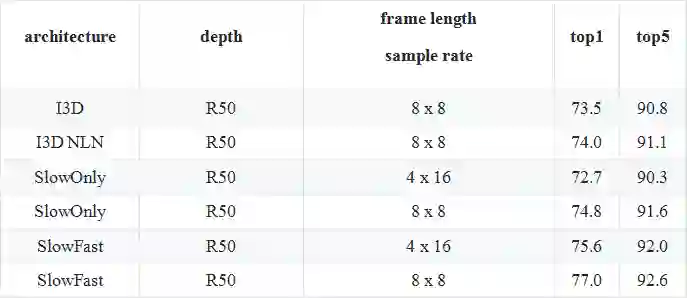 PySlowFast 在视频分类数据库 Kinetics 400 上的性能)(节选自 https://github.com/facebookresearch/SlowFast/blob/master/MODEL_ZOO.md)