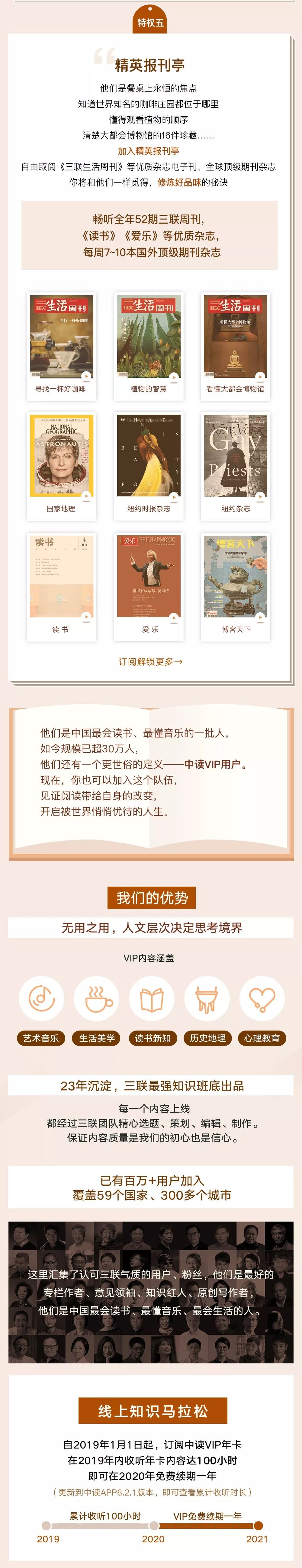 如果你想免费收听以上专题,小编良心推荐中读VIP年卡。除听书外,购买VIP年卡,还可免费领取收听500+独家听书、200+大咖说、150+听外刊、365+听周刊等精彩内容。还可享受特权福利。