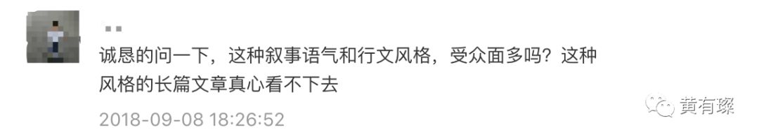 这位读者出言典雅且有礼貌,一针见血地提出了自己对于文章”叙事语气“和”行文风格“地质疑,最后告诉作者,无法接受这类风格的长篇文章。这样地批评就非常地高效且有助于帮助作者意识到文章问题所在了。