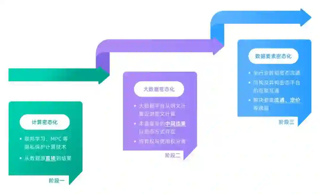 数据密态时代,每个阶段的技术要求和应用侧重不同,需要经历三个发展阶段,依次是:“计算密态化”、“大数据密态化”、“数据要素密态化”。