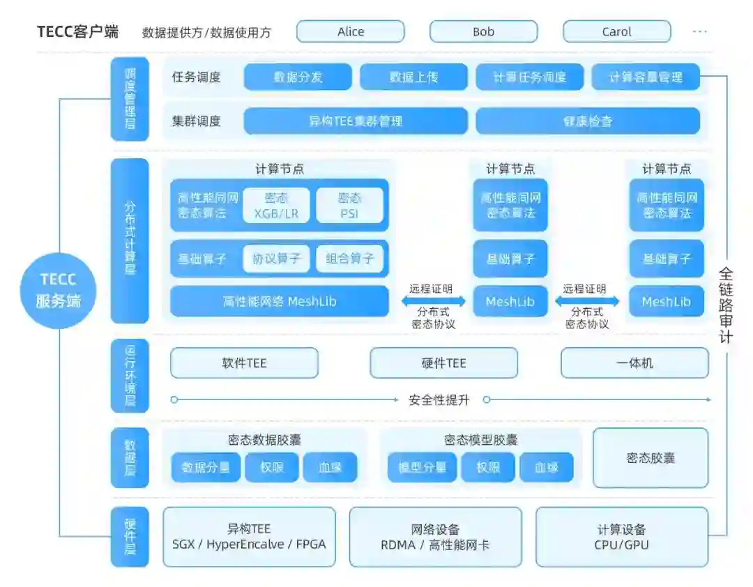 TECC在架构设计上包含了参与方层、调度管理层、分布式计算层、运行环境层、数据层和硬件层。