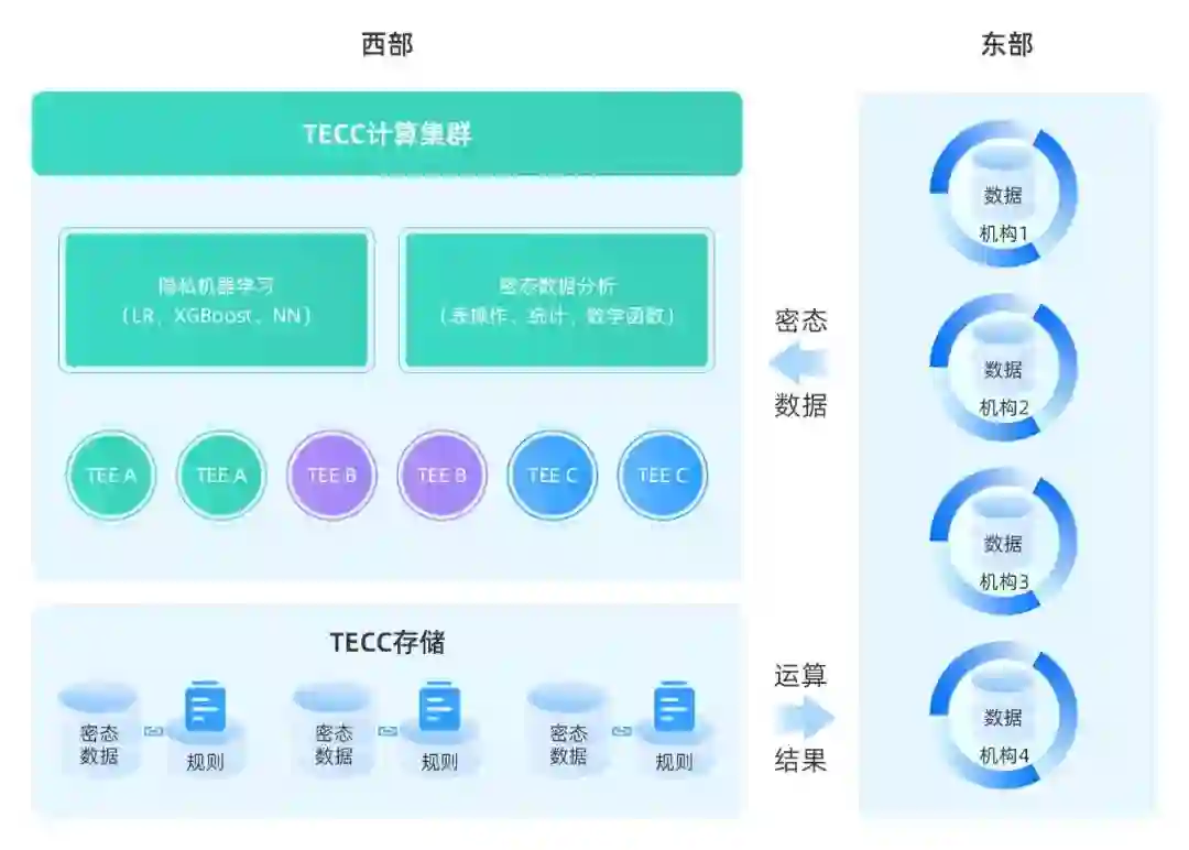 TECC支持任意多的参与方、支持复杂的运算逻辑的特性,还能在综合性密态数据中心(如东数西算)等得到应用。