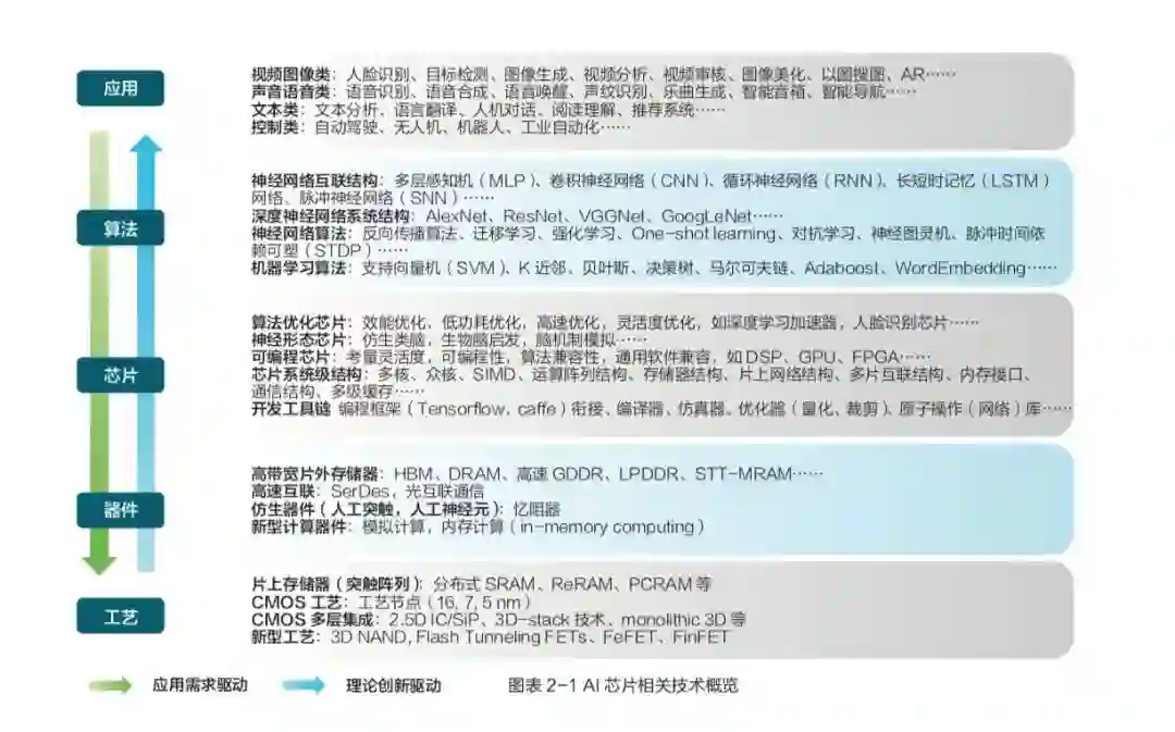 AI 技术的落地需要来自多个层面的支持,贯穿了应用、算法机理、芯片、工具链、器件、工艺和材料等技术层级。各个层级环环紧扣形成AI的技术链,而AI芯片本身处于整个链条的中部,向上为应用和算法提供高效支持,向下对器件和电路、工艺和材料提出需求。