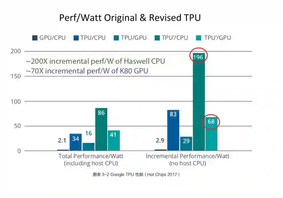 由于使用了专用架构,TPU 实现了比同时期 CPU 和 GPU 更高的效率。