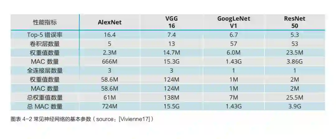 从上图可见,AI 芯片中需要存储和处理的数据量远远大于之前常见的应用。 比如,在常见的深度神经网络的主要参数中,VGG16 网络需要 138M 个权重参数,一次推断过程需要 15.5G 次乘累加运算。