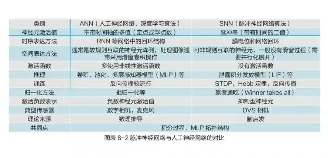 广义上来讲,神经形态计算的算法模型可以大致分为人工神经网络 (Artificial Neural Network, ANN)、脉冲神经网络 (Spiking Neural Network, SNN),以及其他延伸出的具有特殊数据处理功能的模型。在没有历史记忆情形下,SNN 与 ANN 具有一定程度的等价性。