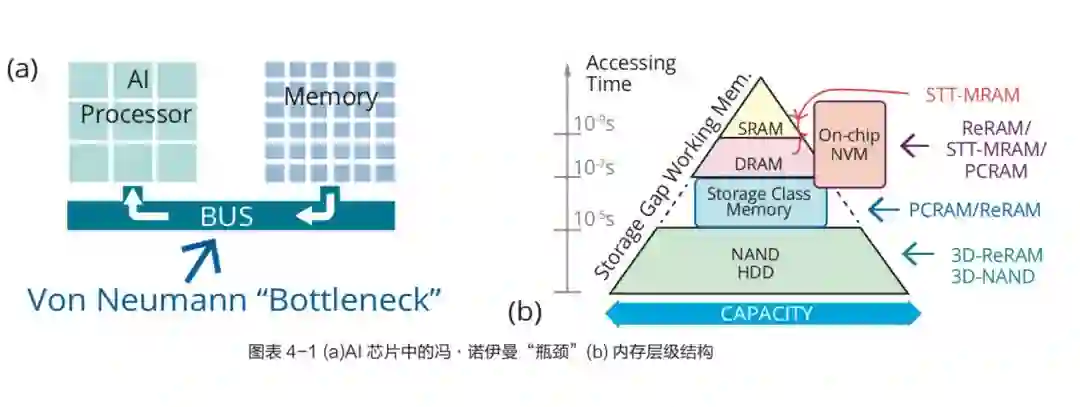在传统冯·诺伊曼体系结构中,数据从处理单元外的存储器提取,处理完之后在写回存储器。在 AI 芯片实现中,由于访问存储器的速度无法跟上运算部件消耗数据的速度,再增加运算部件也无法得到充分利用,即形成所谓的冯·诺伊曼「瓶颈」,或「内存墙」问题,是长期困扰计算机体系结构的难题。