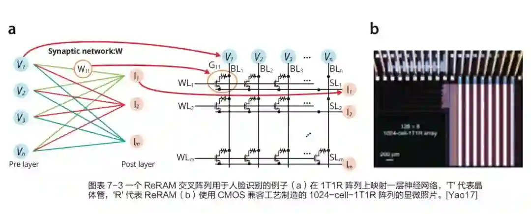 上图就是一个 RRAM 交叉阵列的例子,其中矩阵权重被表示为电导。交叉阵列非常自然地实现了向量和矩阵乘法,使用图中集成 1024 单元的阵列进行并行在线训练,清华大学吴华强课题组在国际上首次成功实现了灰度人脸分类。