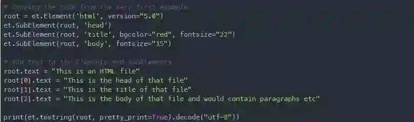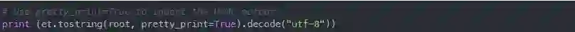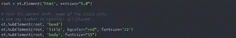 在上面的代码中,您需要知道Element函数至少需要一个参数,而SubElement函数至少需要两个参数。这是因为Element函数只“需要”将要创建的元素的名称,而SubElement函数不仅需要根节点的名称,还需要将要创建的子节点的名称。