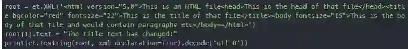 使用etree模块,我们可以创建XML/HTML元素及其子元素,这在我们试图写入或操作HTML或XML文件时非常有用。我们来尝试使用etree创建一个HTML文件的基本结构:
