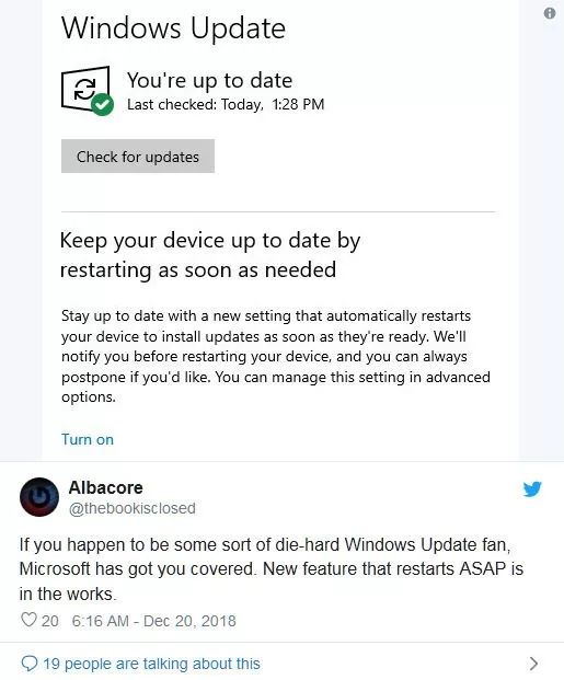 如果这个“尽快重启(restart ASAP)”功能真的要推出,那么它很有可能会随下一个Windows版本(代号19H1,计划2019年4月左右发布)到来。
