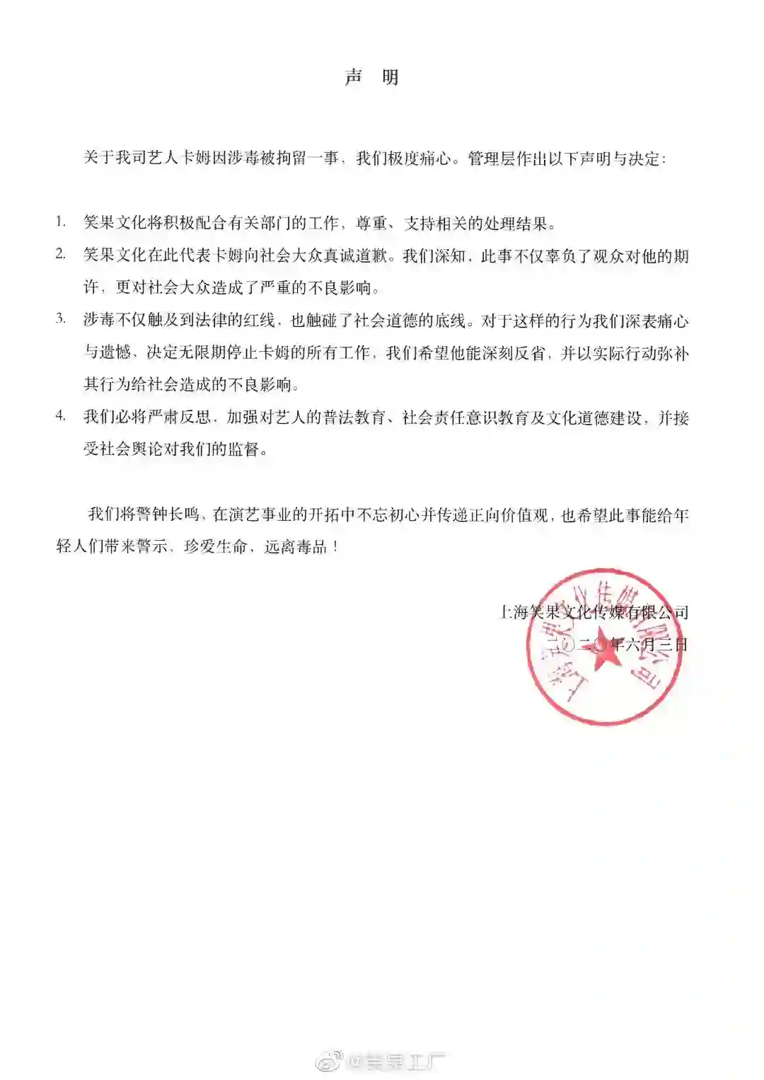 笑果文化发声明回应卡姆吸毒被行拘:无限期停止其所有工作。