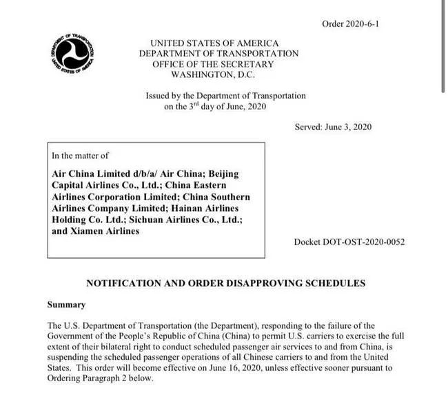当地时间3日,美国交通部正式宣布,因中方没有允许美国航空公司提供往来中国的服务,美方将暂停允许中国航空公司提供来往于美国的航班,相关规定从当地时间6月16日开始执行,但仍有可能提前。(央视新闻)