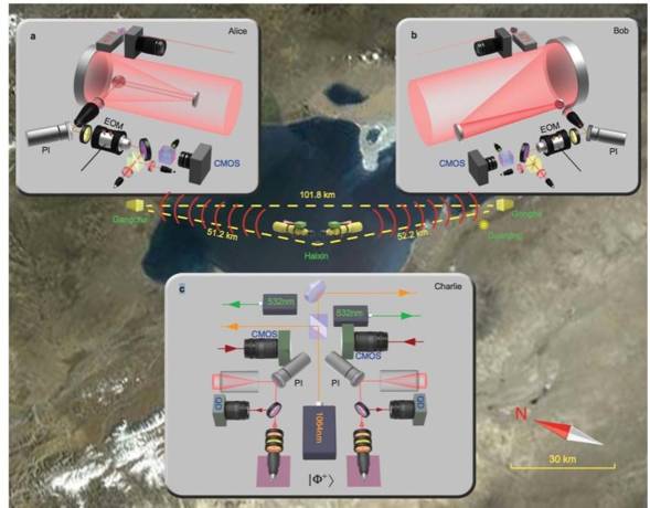 潘:我们已经建成了量子安全通信京沪干线。作为世界上第一条长距离量子安全通信线路,这条线路已经在2017年9月投入使用。这条城际量子通信线路连接了北京、济南、合肥和上海,长度超过2000千米,由32个中继站组成。通过这一线路,数据能够在保证信息理论安全的情况下进行传输。更多的骨干网络和城域网正在计划建设。我们还在2016年8月16日发射了第一颗量子科学卫星“墨子号”。我们已经在墨子号和多个地面站之间进行了量子密钥分发,这些地面站位于中国的北京、德令哈、南山,以及奥地利的格拉茨和西班牙的特内里费等。我们还同时借助京沪干线和墨子号,实现了洲际量子密钥分发。越来越多的卫星将发射并组成一个全球性网络。