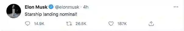 马斯克在着陆后发了一条推特。nominal是一个航天工业术语,用来指事情按计划进行时