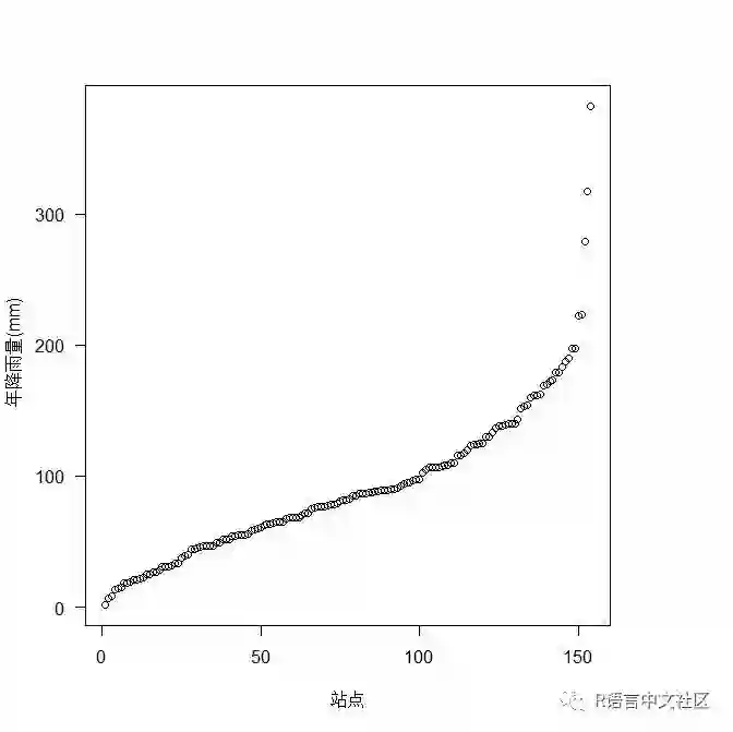 plot(sort(Data$rain), ylab=" 年降雨量(mm)", las=1, xlab='站点')