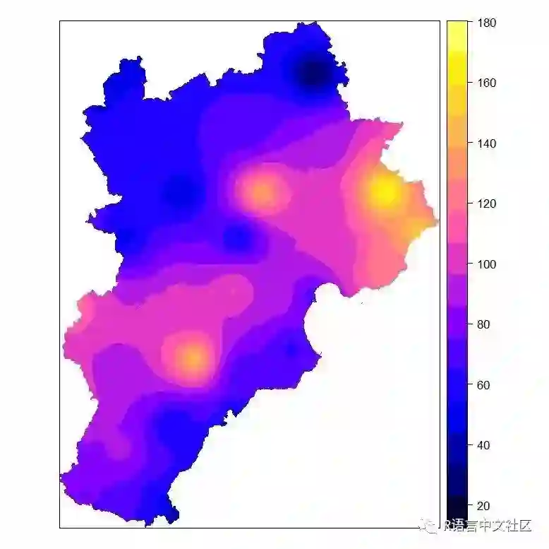 kri<-krige(formula=rain~1,model=v.fit,locations=dsp,newdata=Grid,nmax=12, nmin=10)#location为已知点的坐标;newdata为需要插值的点的位置;nmax和nmin分别代表最多和最少搜索点的个数