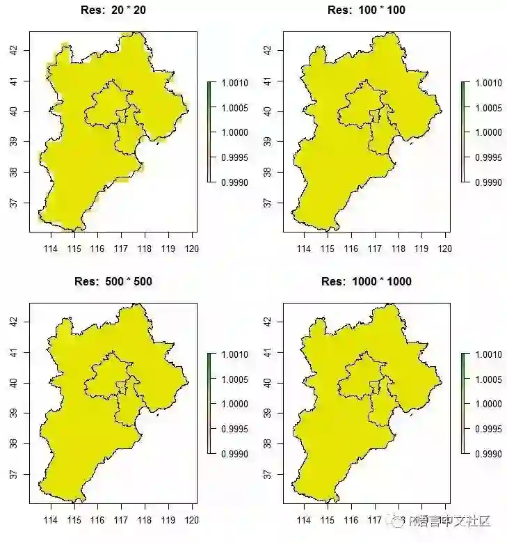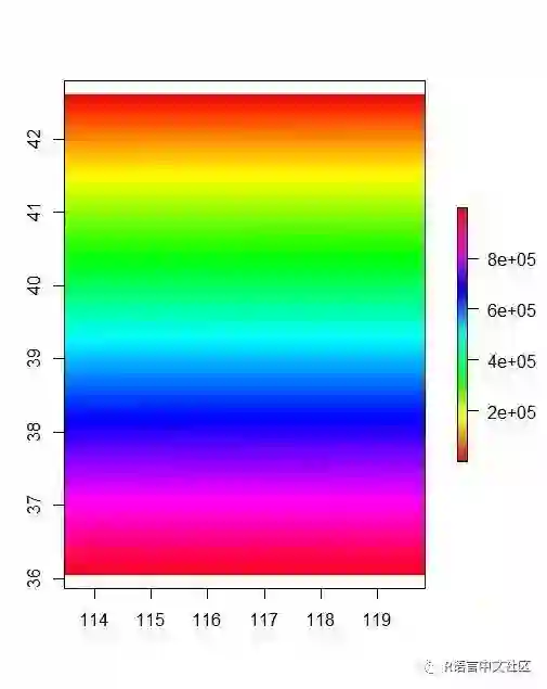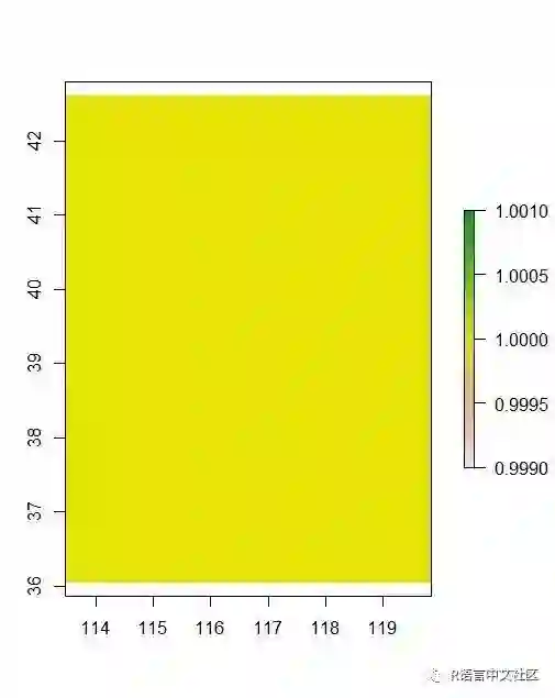 因为给栅格的赋值都为1,因此上图显示的也只有一个颜色,你也可以给栅格赋值多个,即nrow*ncol