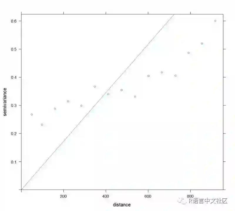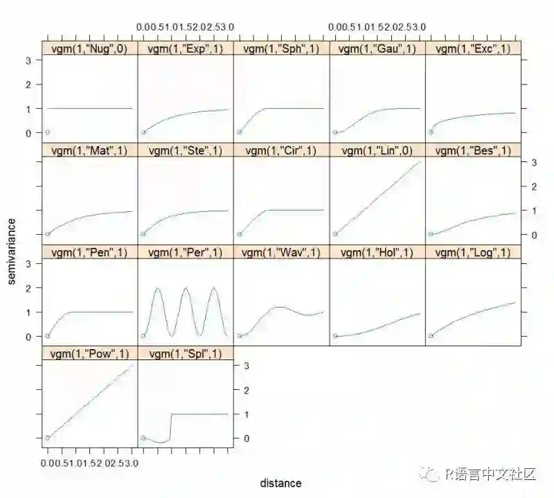 根据半变异图可知,已知点的自相关关系semivariance随着距离distance的增加而增加,通过其分布,可初步确定用线性函数来拟合:确定哪些函数可以用show.vgms()实现。
