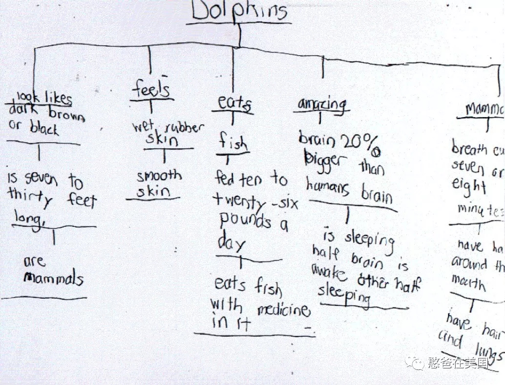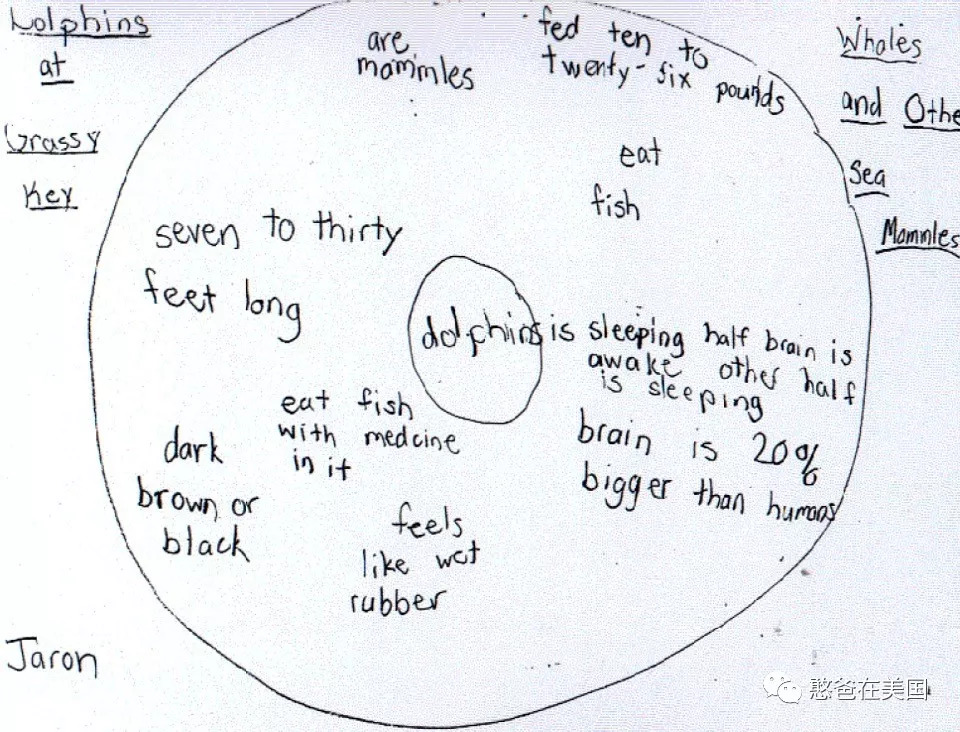 中间圆圈写的是dolphin(海豚),这个是主题,接着周围一圈圆写的是他调研出来的结果,有的是“eat fish”(吃鱼),有的是“seven to thirty feet long”(7到30尺),有的是“dark brown or black”(深褐色或者黑色)… 通过这张Circle Map(圆图),孩子就把他所了解到的关于海豚的特性都罗列了出来。