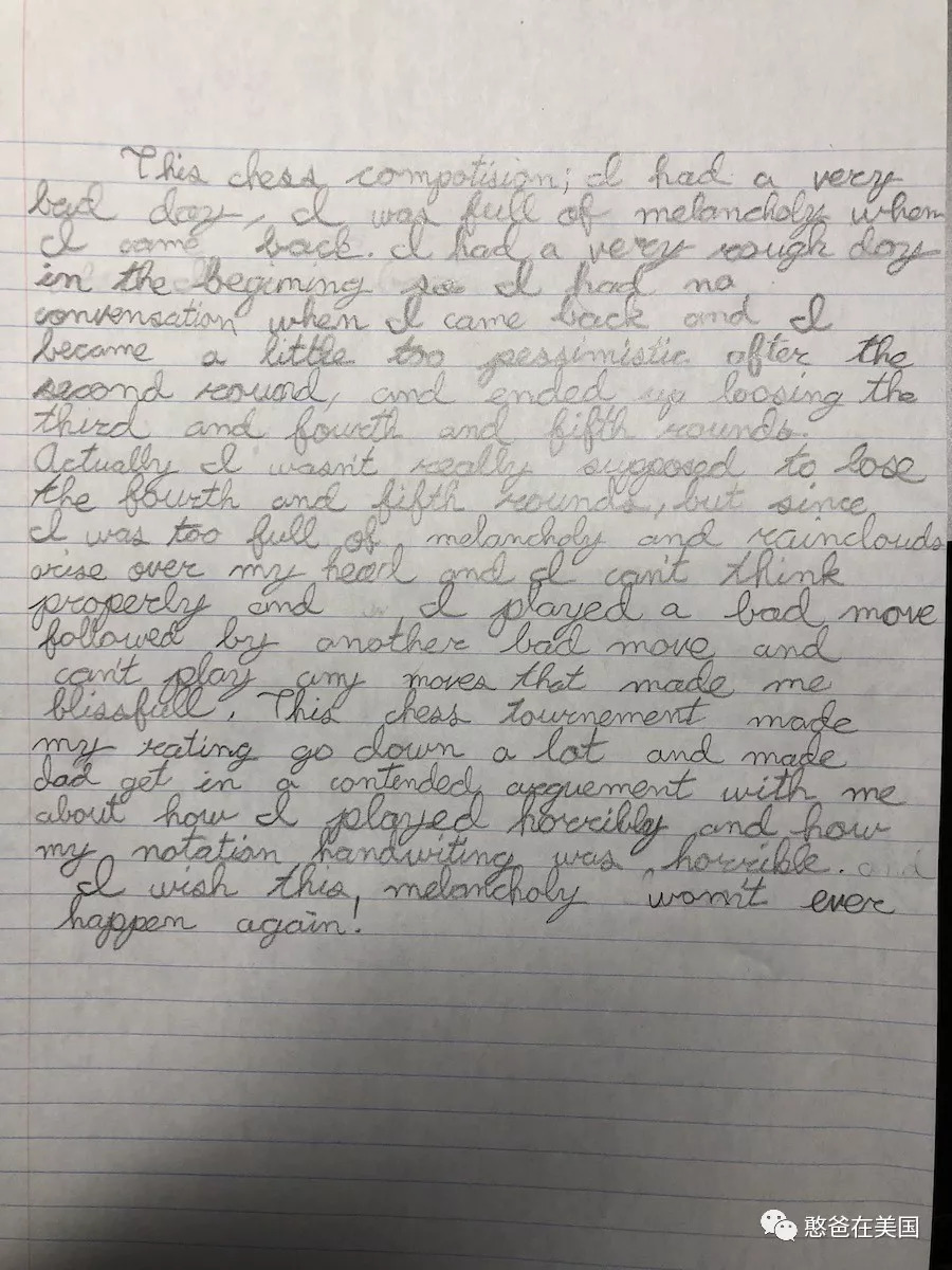让孩子爱上写作是需要一个过程的,我也是花了3年才将孩子的写作拉上正轨。现在憨憨的写作能力还OK,上周参加国际象棋比赛,他回来还写了几百字的总结日记,