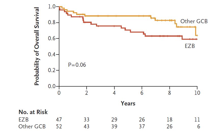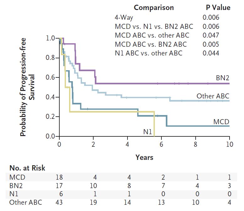 该研究共纳入574例DLBCL的活检病例,并通过外显子测序及转录组测序、基于芯片技术的DNA拷贝数分析、有针对性的扩增子测序等方法对372个基因进行了分析,希望检出有重现性异常的基因。根据该研究设计的方案,研究作者确定出DLBCL四个主要遗传学亚型,并分别将其命名为:MCD型(同时出现MYD88L265P、CD79B的突变)、BN2型(具有BCL6融合与NOTCH2突变)、N1型(具有NOTCH1突变)、EZB型(具有EHZ2突变及BCL2易位)。这四种亚型之间的遗传学标记不同,且对免疫治疗及化疗的反应也有所不同:BN2型及EZB型疗效较好,而MCD型和N1型预后较差。遗传学通路分析表明MCD型和BN2型DLBCL与“慢性活化型”B细胞受体信号通路有关,而该通路与疗效欠佳有关。