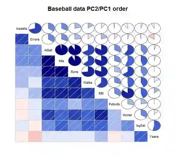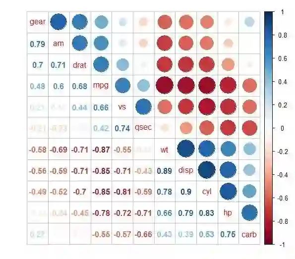 上图中,上三角面板以不同颜色和大小的圆形表示相关性大小,其中,蓝色表示正相关,红色表示负相关;颜色越深、圆形越大代表相关性越高;下三角面板在原有图形的基础上叠加而成(如果想仅显示部分,可不再叠加),用相关系数的数值和颜色表示相关性方向和大小,并利用AOE(前两个特征向量的角排序)对变量进行重排序。