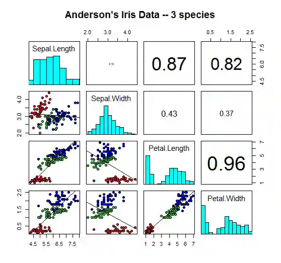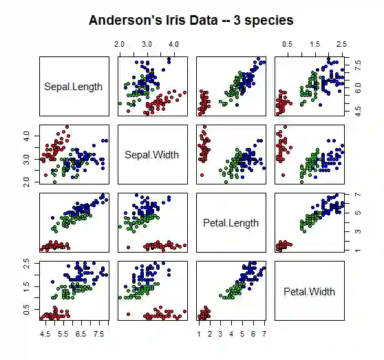 pairs(iris[1:4], main = "Anderson's Iris Data -- 3 species",