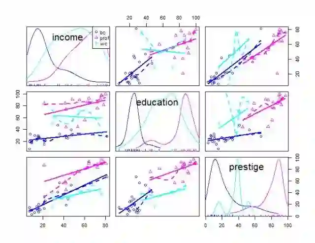 scatterplotMatrix(~ income + education + prestige | type, data=Duncan)