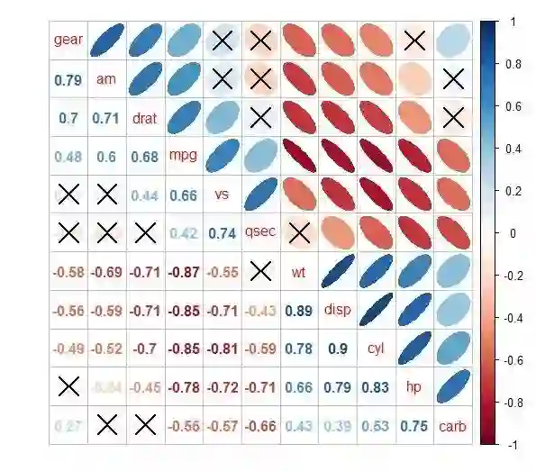上图中,上三角面板绘制椭圆形,下三角显示相关系数,并设置没通过统计相关性检验的结果打X。