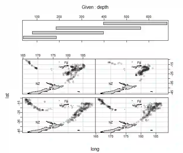 quakes {datasets} 数据集反映了1964年以来斐济岛附近发生的震级MB大于4.0的地震事件数据,如果我们想知道该地区在地震深度分布上是否均匀,可以令深度变量为条件变量,绘制条件分割图,观察在不同条件下地震发生地点(经纬度)是否有变化。图示上方是用矩形条标记出来的条件变量的取值范围,下方是条件散点图,从图中可以清楚地看出,随着深度值的增加,地震发生地点逐渐由西向东、由南向北移动,震源较深的地震都发生在离斐济岛很近的东南侧。