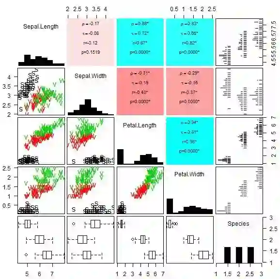 上图中,4*4矩阵反映了iris前4列Sepal.Length 、Sepal.Width 、Petal.Length、Petal.Width变量两两之间的相关关系,其中,上三角显示了相关关系的数量特征,如相关系数、p值等;下三角为散点图,不同种类的鸢尾花用不同颜色、不同点型表示;最右侧一列和最下方一行则分别对三种鸢尾花的花萼和花瓣长宽进行了简单的描述性统计分析。