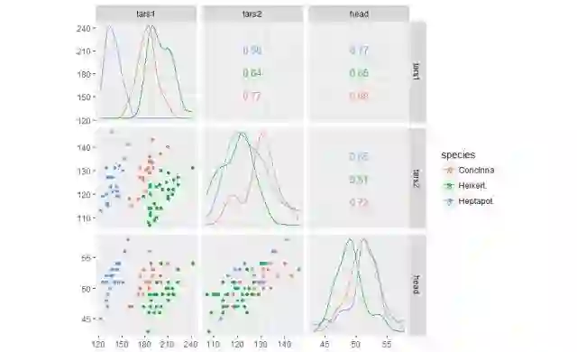 ggpairs(flea, columns = 2:4, ggplot2::aes(colour=species))