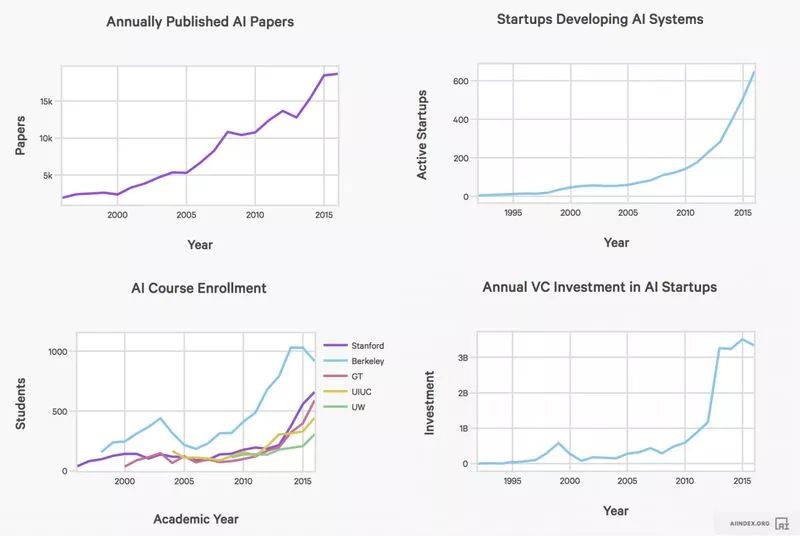 在该报告中,研究人员们参考了多个发展的指标,比如“活动范围”和“技术性能”。在这两个指标中,前者包含了 AI 领域中一切活动,从学术会议的参与人数,到课程的学生数,到风投的投资金额和初创公司的数量。简单来说,这一切都是“越来越多”,用图表展示的话,就是一切都在向右上方发展。