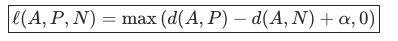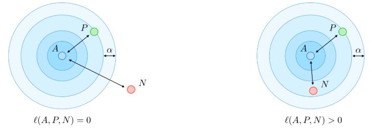 Triplet loss ℓ是在图像A (anchor), P (positive) 和N (negative)这三个图像的嵌入表示上计算的损失函数。 anchor和positive示例属于同一个类,negative示例属于另一个类。通过调用margin参数,该损失定义如下: