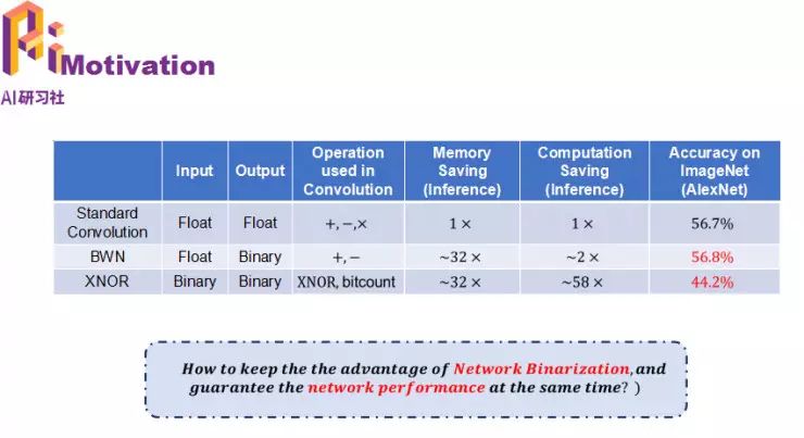 接下来介绍这篇文章的motivation,之前的XNOR网络虽然能实现58倍的加速,但网络精度出现大幅下降。我们希望既能利用二值化带来的便利,也避免网络精度的大幅度下降。