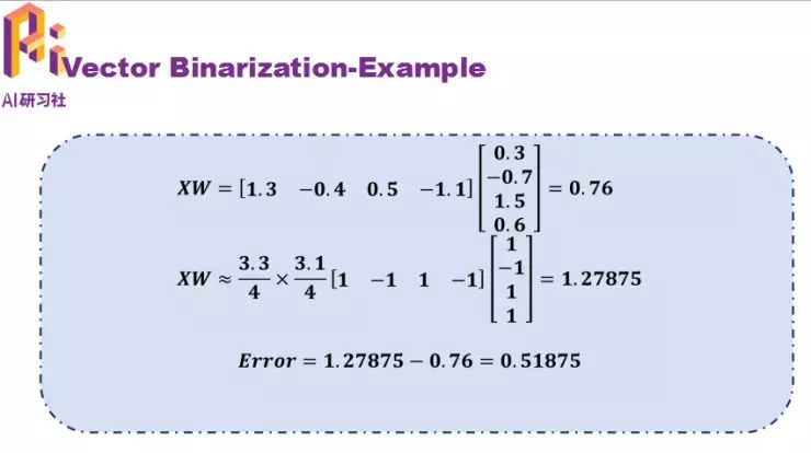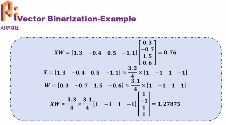 下面举个例子,如何运用向量二值化来二值化向量的內积。如下是四维向量相乘的例子: