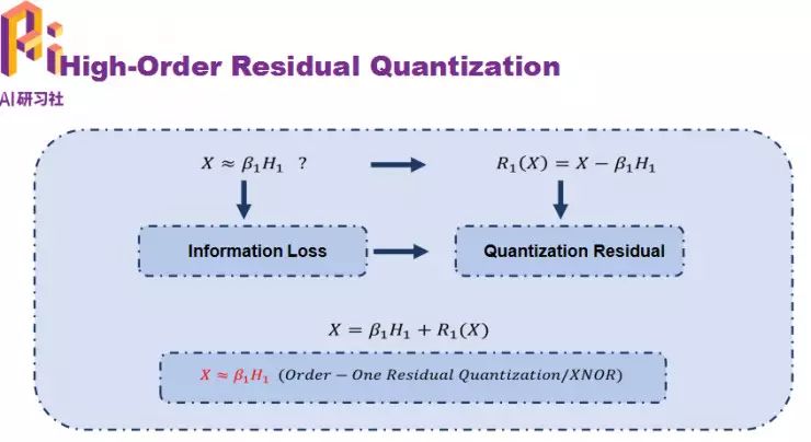 如图左所示是原来二值化方法的信息损失,我们定义量化残差的概念来描述信息损失: