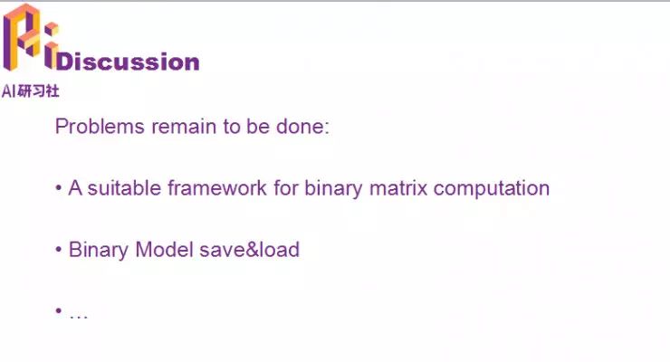 接下来是一些问题。实际上HORQ网络模型依赖于二值化矩阵乘法的计算,需要一些比较合适的框架,二值模型的存储和载入与浮点数的存储和载入不一样。