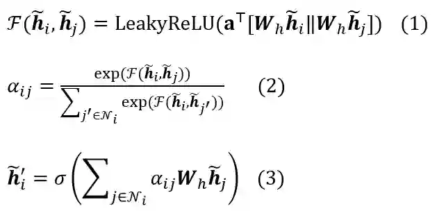 首先,由公式1计算出hi邻接节点hj的重要性,然后通过公式2获取attention分数,最后使用求和的方式得到节点更新后的表示。这里我们还引入了多头注意力机制。