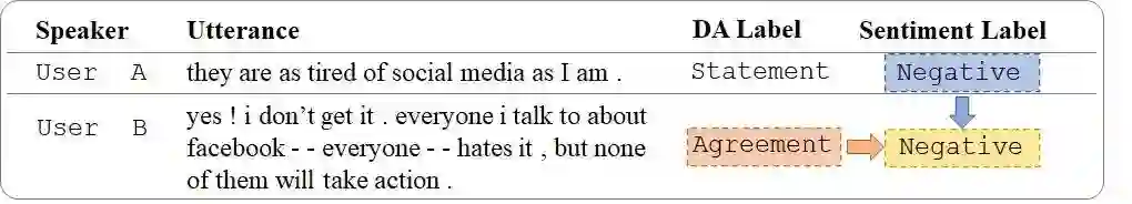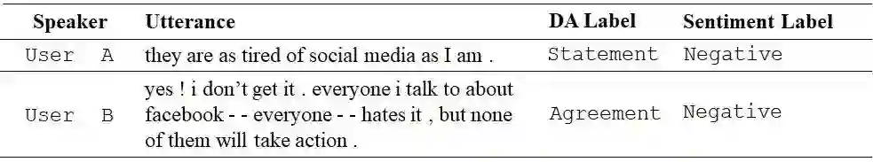 更具体的来说,对话行为识别和对话情感分类都可以看作是分类任务,目标是将对话中的每条语句标注上对应的DA标签和SC标签。