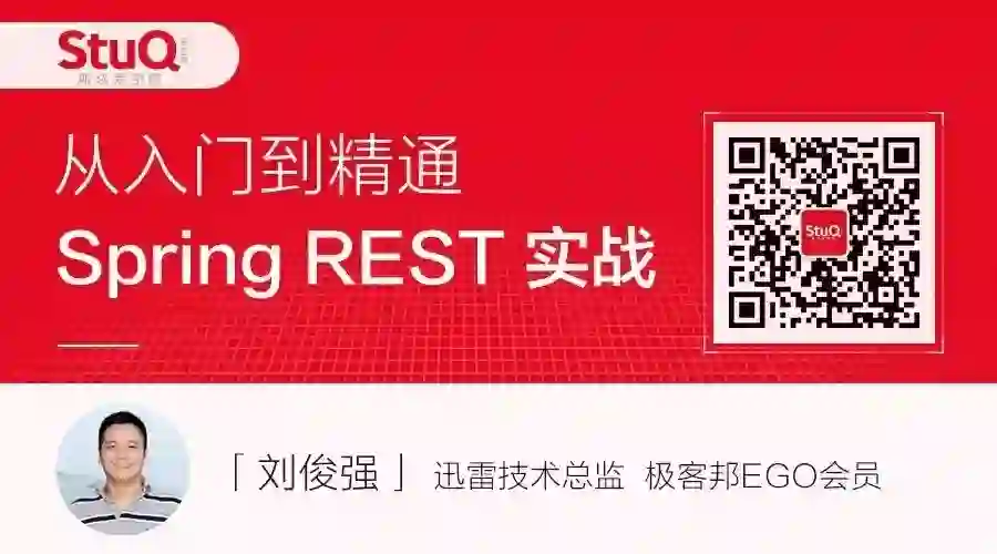 斯达克学院 StuQ 特邀请迅雷技术总监刘俊强老师联合策划推出《从入门到精通 Spring REST 实战》系列课程内容,以翻转课堂形式呈现,用视频教程配合在线答疑的形式帮助学员从入门到精通,快速掌握 Spring REST 实战核心技能。