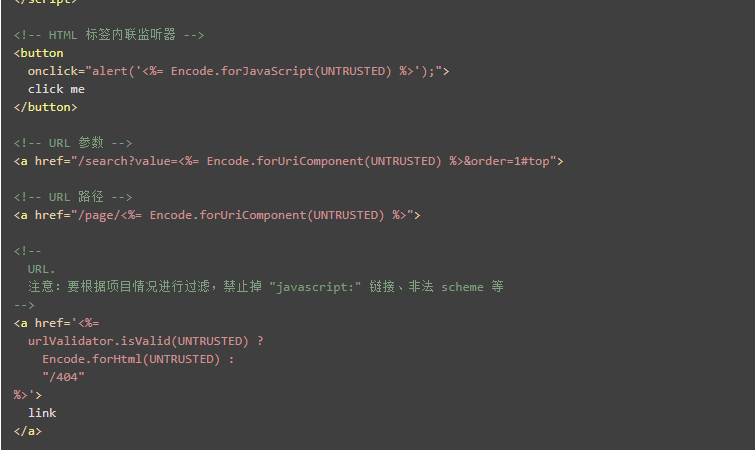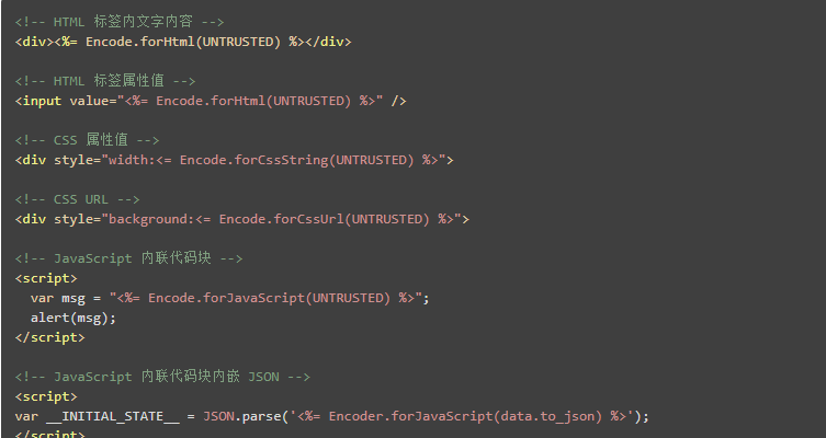 例如 Java 工程里,常用的转义库为 org.owasp.encoder。以下代码引用自 org.owasp.encoder 的官方说明。