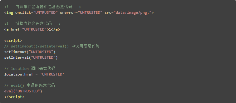 DOM 中的内联事件监听器,如 location、onclick、onerror、onload、onmouseover 等,<a> 标签的 href 属性,JavaScript 的 eval()、setTimeout()、setInterval() 等,都能把字符串作为代码运行。如果不可信的数据拼接到字符串中传递给这些 API,很容易产生安全隐患,请务必避免。