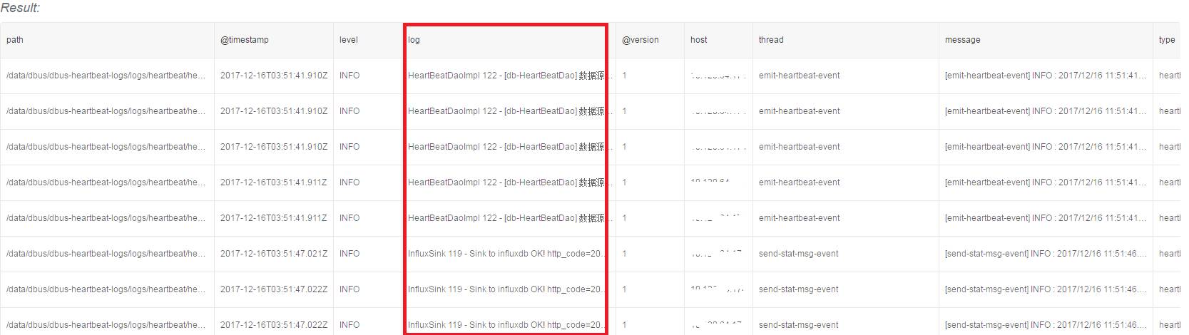 可以看到由Logstash 预先提取已经包含了log4j的基本信息,例如path、@timestamp、level等。但是数据日志的详细信息在字段log中。由于不同的数据日志输出是不一样的,因此可以看到log列数据是同的。