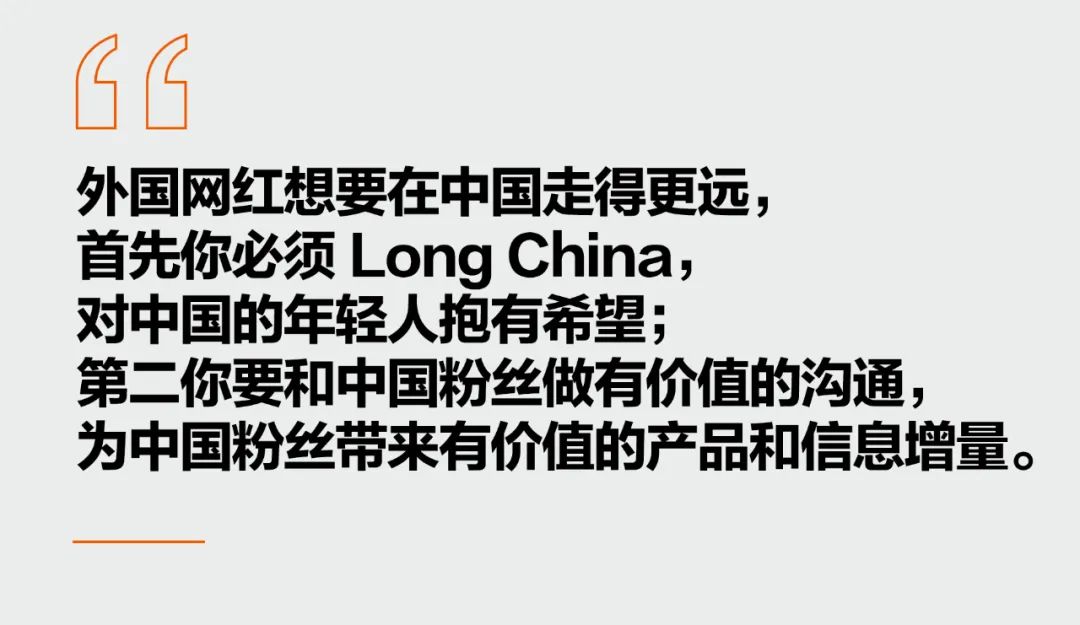 外国网红想要在中国走得更远,首先你必须Long China,对中国的年轻人抱有希望,坚信这片土地会生长出一个更好的中国;第二你要和中国粉丝做有价值的沟通,为中国粉丝带来有价值的产品和信息增量。